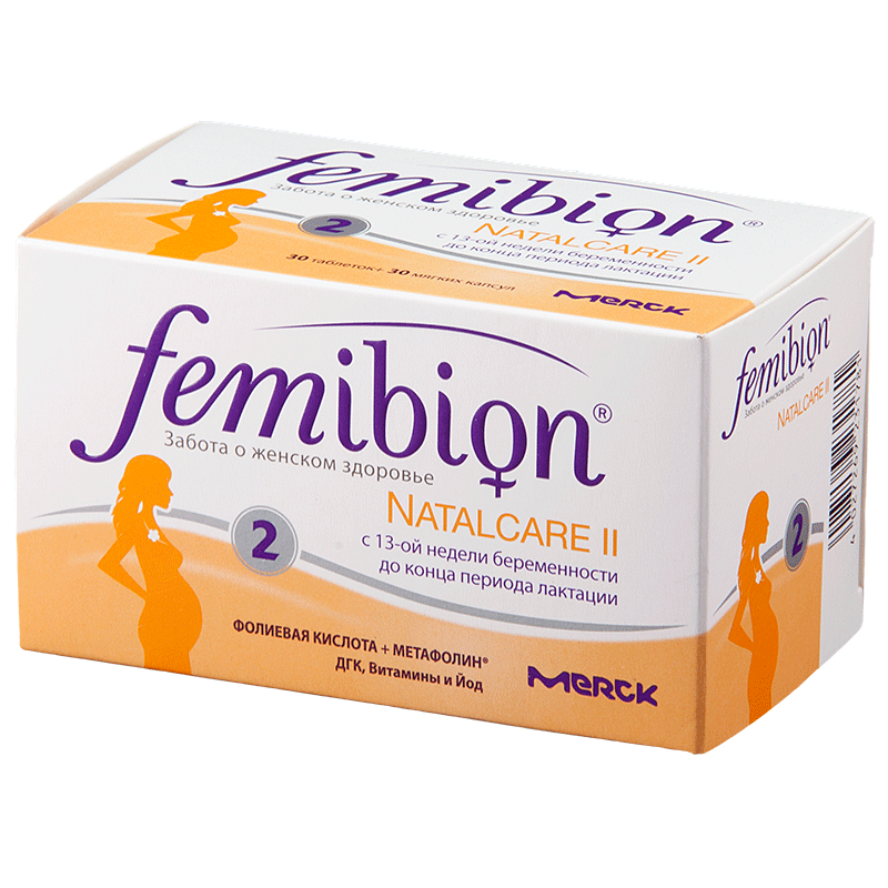 Фемибион Наталкер 2 обеспечивает необходимый уровень содержания фолатов в организме во время беременности и в период кормления грудью даже у тех женщин, организм которых не может полностью преобразовывать и впоследствии усваивать фолиевую кислоту. Каждая таблетка содержит фолиевую кислоту, метафолин, 9 жизненно необходимых витаминов и йод. Каждая мягкая капсула содержит эссенциальную омега-3 жирную кислоту — ДГК и витамин Е.