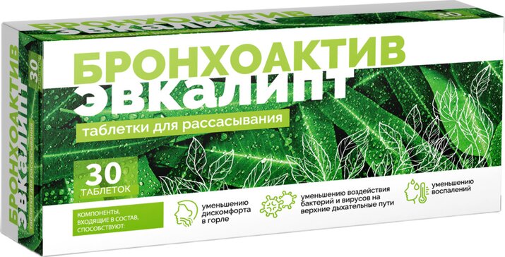 Составляющие биологически активной добавки «Эвкалипт Бронхоактив®» способствуют уменьшению воздействия вирусов и бактерий на верхние дыхательные пути, а также снижению выраженности воспаления. Сочетание входящих в состав БАД компонентов дополнительно содействует восстановлению тканей и облегчению болезненных ощущений в горле.