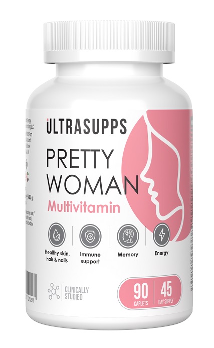 УЛЬТРАСАППС Прити Вумен Мультивитамин (ULTRASUPPS Pretty Woman Multivitamin) - мультивитаминный комплекс для женщин. Компания Ultrasupps разработала специальный мультивитаминный комплекс для женщин под названием Pretty Woman Multivitamin Formula. Продукт содержит более 50 важных для здоровья и красоты женщин компонентов и обеспечивает баланс витаминов и микроэлементов, которые помогут справиться со стрессом, а также наполнят жизненной энергией. Он идеально подходит для женщин, проживающих в больших городах, нуждающихся в дополнительных витаминах и минералах для поддержания энергии, нормализации обмена веществ, укрепления иммунитета, сохранения женского здоровья и красоты.