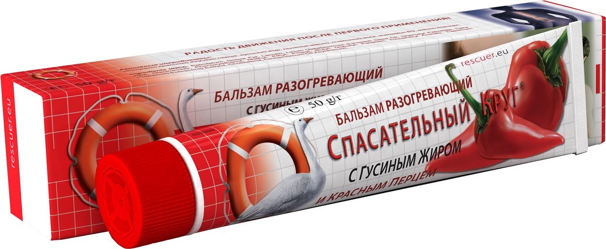 СПАСАТЕЛЬНЫЙ КРУГ БАЛЬЗАМ РАЗОГРЕВАЮЩИЙ С ГУСИНЫМ ЖИРОМ И КРАСНЫМ ПЕРЦЕМ - Разогревающий бальзам представляет собой средство для наружного применения при дискомфорте в области позвоночника, суставов и мышц. Внешний вид и свойства: Кремовая текстура белого цвета с легким, ненавязчивым запахом. Бальзам оказывает глубокое и длительное разогревающее действие. Бальзам может быть рекомендован в качестве вспомогательного средства при дегенеративно-дистрофических и воспалительных заболеваниях суставов и позвоночника. Содержит экстракт красного жгучего перца, гусиный жир, льняное масло, пчелиный воск, никотиновая кислота (витамин В3), эфирное масло корицы.