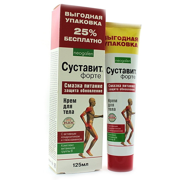 Крем Суставит форте для тела смазка для суставов с хондроитином и глюкозамином. Восстанавливает нормальный метаболизм костно-хрящевой и мышечной ткани, оказывает эффективное болеутоляющее, противовоспалительное и противоотечное действие, тормозит процесс дегенерации и стимулирует регенерацию поврежденных хрящевых поверхностей.Эффективность основана на свойствах компонентов, дополняющих и усиливающих действие друг друга. Хондроитин сульфат и глюкозамин сульфат. Являются основными составляющими хрящевой ткани и естественными защитниками (хондропротекторами) клеток хряща. Совместное применение хондроитина и глюкозамина обеспечивает более быстро насыщение организма хондропротекторами по сравнению с действием одного компонента, а также более выраженный клинический эффект. Хондропротекторы обеспечивают питание и жизнеспособность хондроцитов, тормозят деградацию пораженных хрящевых тканей и стимулируют восстановление хрящевых поверхностей.