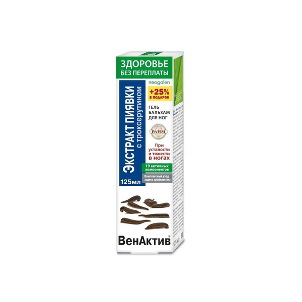 Гель-бальзам Неогален (Neogalen) ВенАктив Экстракт пиявки для ног с троксерутином. Эффективное средство на основе натуральных биоактивных компонентов. Способствует устранению усталости и тяжести в ногах, уменьшению вечерних отеков. Оказывает комплексное положительное действие. Способствует активизации функции венозных клапанов, микроциркуляции и лимфооттока. Снижает риск возникновения трофических изменений кожи (сухость ,шелушение, истонченность). Питает, смягчает, увлажняет и освежает кожу ног.