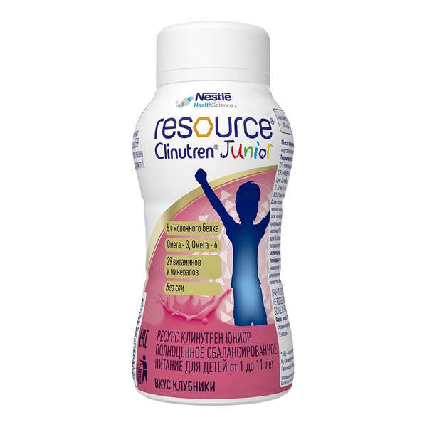 Смесь Resource® Clinutren® Junior с ароматом клубники - легкий способ обеспечить ребенка в возрасте с 1 года до 11 лет полноценным сбалансированным питанием. В 200 мл смеси содержатся все необходимые питательные вещества, включая цельный молочный белок, важные витамины и микроэлементы.Все, что нужно для поддержки организма во время болезни, выздоровления, в периоды интенсивных физических и умственных нагрузок и активного роста. Ресурс Клинутрен Юниор - инновационный подход к питанию в медицине и повседневной жизни. А удобный формат бутылочки позволяет взять готовый напиток в школу, на занятия или тренировку. Родители оценят, что одна бутылочка готового к употреблению напитка приравнивается к полноценному приему пищи. А также, что в продукте нет сои, ГМО, глютена и лактозы. Все, что есть, исключительно полезно: • цельный молочный белок, наполняющий чувством сытости; • Омега-3 и 6, помогающие ребенку лучше усваивать и запоминать информацию;