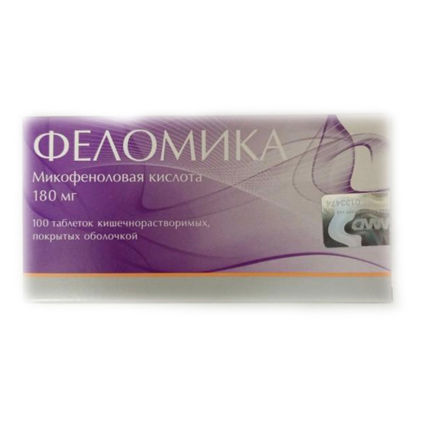 Всасывание После перорального применения микофенолат натрия интенсивно всасывается. Благодаря наличию кишечнорастворимого пленочного покрытия максимальная концентрация микофеноловой кислоты (МФК) достигается приблизительно через 1,5-2 часа. В исследованиях in vitro было показано, что особый состав кишечнорастворимого пленочного покрытия препарата ФЕЛОМИКА препятствует высвобождению МФК в кислой среде, аналогичной кислой среде желудка. У пациентов со стабильно функционирующим почечным трансплантатом, получающих базовую иммуносупрессивную терапию циклоспорином в форме микроэмульсии, степень абсорбции МФК из желудочно-кишечного тракта (ЖКТ) - 93 %, а биодоступность - 72 %. В диапазоне доз от 180 до 2160 мг фармакокинетика микофеноловой кислоты имеет линейный дозозависимый характер. Величина площади под кривой "концентрация-время" (AUC) при приеме микофеноловой кислоты натощак не отличалась от таковой при приеме препарата с пищей с высоким содержанием жира (55 г жира, 1000 калорий).