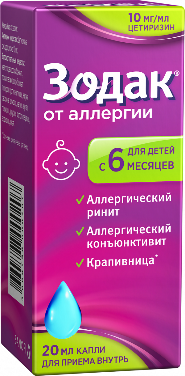 Противоаллергическое средство – H1-гистаминовых рецепторов блокатор. Цетиризин - активное вещество препарата Зодак - является метаболитом гидроксизина, относится к группе конкурентных антагонистов гистамина и блокирует Н1-гистаминовые рецепторы. В дополнение к антигистаминному эффекту цетиризин предупреждает развитие и облегчает течение аллергических реакций.