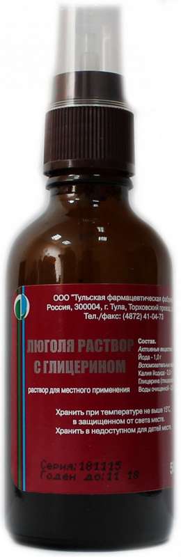 Активное вещество: йод - 1 г; Вспомогательные вещества: калия йодид - 2 г; вода очищенная - 3 г; глицерол 85 % - 94 г.