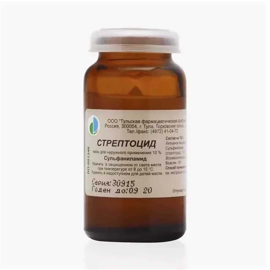 Действующее вещество: сульфаниламид (стрептоцид) - 10 г. Вспомогательное вещество: вазелин - 90 г.