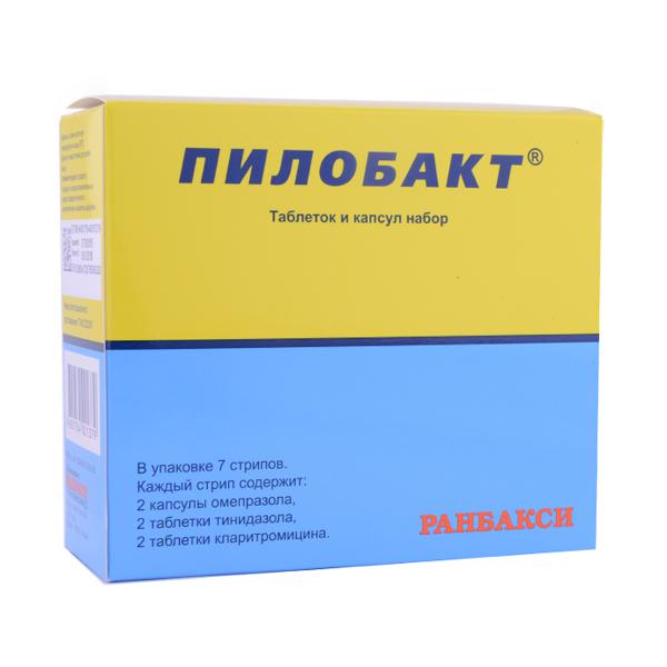 Все три препарата, входящие в состав Пилобакта, обладают хорошей абсорбцией при пероральном приеме. Омепразол быстро всасывается после приема внутрь, его биодоступность составляет 30–40%. Прием пищи не оказывает влияния на биодоступность омепразола. Сmax достигается через 0,5–1 ч. Связь с белками плазмы составляет 90%. Практически полностью метаболизируется в печени. Основной путь выведения — с мочой (80%). Кларитромицин быстро абсорбируется из ЖКТ. Абсолютная биодоступность 250 мг кларитромицина составляет приблизительно 50%. Прием пищи незначительно замедляет начало абсорбции кларитромицина и образование 14-гидроксикларитромицина, но не влияет на биодоступность. При приеме натощак пиковые сывороточные концентрации достигаются в пределах 2 ч после перорального приема и составляют 0.6 и 0.7 мкг/мл для кларитромицина и его основного метаболита. T1/2 кларитромицина составляет 3–4 ч. Кларитромицин широко распределяется в организме.