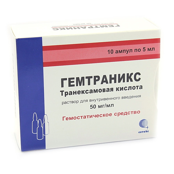 Состав на одну ампулу 50 мг/мл 100 мг/мл Действующее вещество:транексамовая кислота (в пересчете на сухое вещество)250 мг 500 мг. Вспомогательное вещество: вода для инъекций до 5 мл до 5 мл.