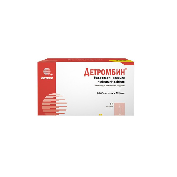 Препарат Детромбин содержит: Действующим веществом является надропарин кальция. Детромбин, 9500 анти-Ха МЕ/1,0 мл, раствор для подкожного введения. Каждый шприц содержит 9500 анти-Ха ME надропарина кальция в 1,0 мл раствора. Прочими вспомогательными веществами являются: кальция гидроксида раствор 0,1 % или хлористоводородной кислоты раствор 0,1 М, вода для инъекций.