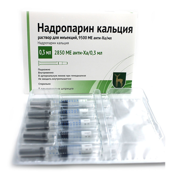 Надропарин кальция 9500 МЕ анти-Ха Вспомогательные вещества: кальция гидроксид или хлористоводородная кислота - до рН 4.5-7.5, вода д/и - до 1 мл.