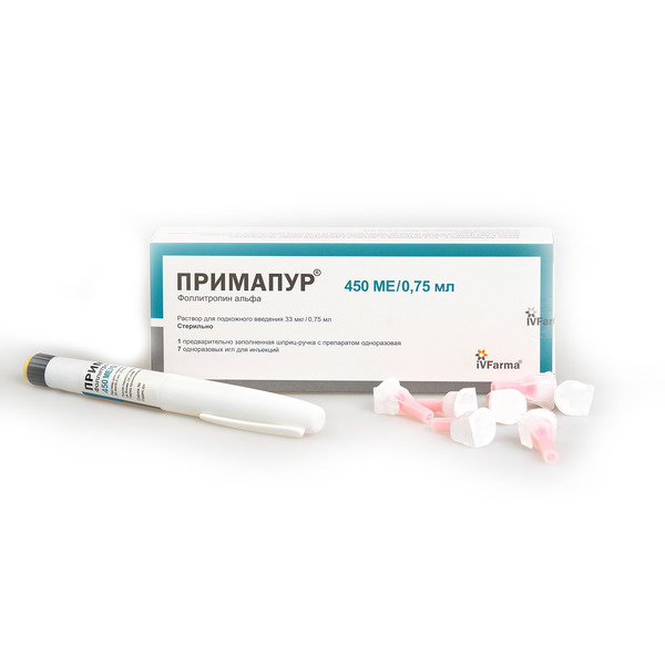 1 шприц-ручка содержит: фоллитропин альфа - 33 мкг (450 МЕ); Вспомогательные вещества: сахароза - 34.23 мг, метионин - 0.25 мг, полисорбат 20 - 0.1 мг, натрия гидрофосфата дигидрат - 0.555 мг, натрия дигидрофосфата моногидрат - 0.27 мг, бензиловый спирт - 5 мг, натрия гидроксида раствор 10% - q.s., фосфорная кислота (раствор 17%) - q.s., вода д/и - до 0.7 мл.