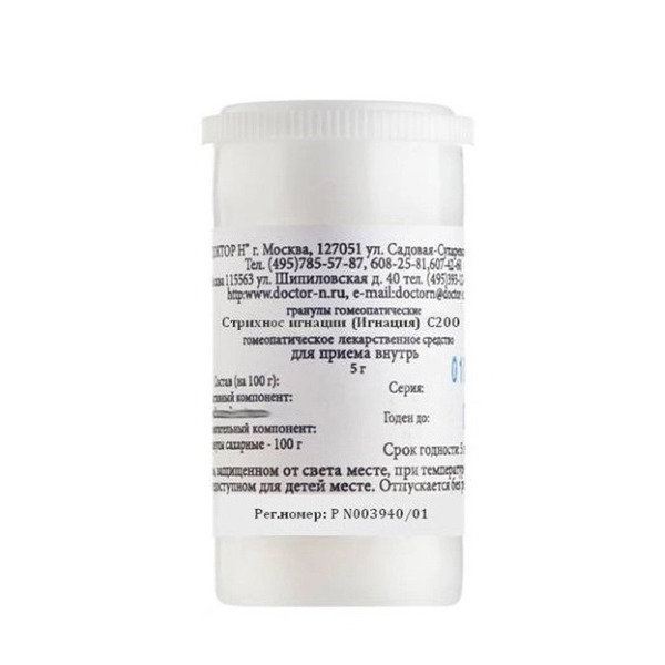 Состав (на 100 г): активный компонент: Strychnos ignatii (Ignatia) Стрихнос игнации (Игнация) C200 - 1,0 г вспомогательный компонент: гранулы сахарные - 100 г.
