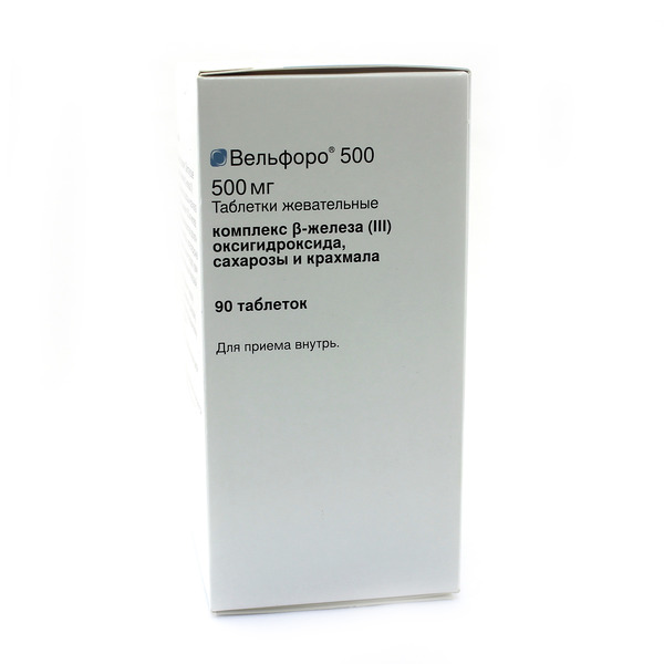 Механизм действия препарата Вельфоро 500 состоит в связывании фосфата в ЖКТ, следовательно, концентрация данного препарата в сыворотке крови не имеет отношения к его эффективности. Вследствие нерастворимости и особенностей расщепления препарата Вельфоро 500 возможность проведения классических фармакокинетических исследований, например, определения значений объема распределения, площади под фармакокинетической кривой, среднего времени удерживания, и т.д. отсутствует. Всасывание Действующее вещество препарата Вельфоро 500 практически нерастворимо, и, следовательно, не абсорбируется в ЖКТ. Однако продукты расщепления, моноциклические железосодержащие соединения, могут высвобождаться с поверхности pn-FeOOH и абсорбироваться. Распределение Вследствие нерастворимости и особенностей расщепления препарата Вельфоро 500 возможность проведения классических фармакокинетических исследований указанного препарата отсутствует.
