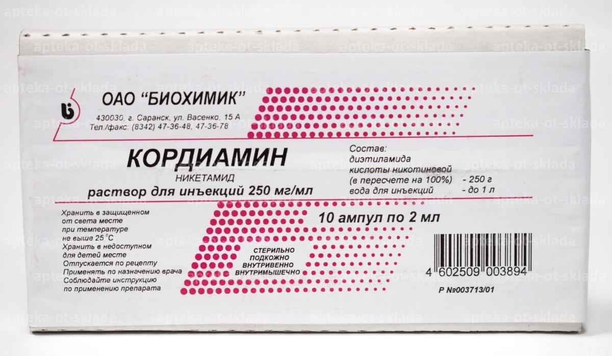 П/к, в/м и в/в вводят взрослым в дозе 1–2 мл 1–3 раза в день, детям под кожу — 0,1–0,75 мл в зависимости от возраста. Введение в вену должно производиться медленно. П/к и в/м инъекции Кордиамина болезненны; для уменьшения болезненности иногда предварительно можно ввести в место инъекции новокаин (взрослым 1 мл 0,5–1% раствора, детям — в соответствии с возрастом). Высшая разовая доза под кожу и в вену при отравлении наркотиками—5 мл.