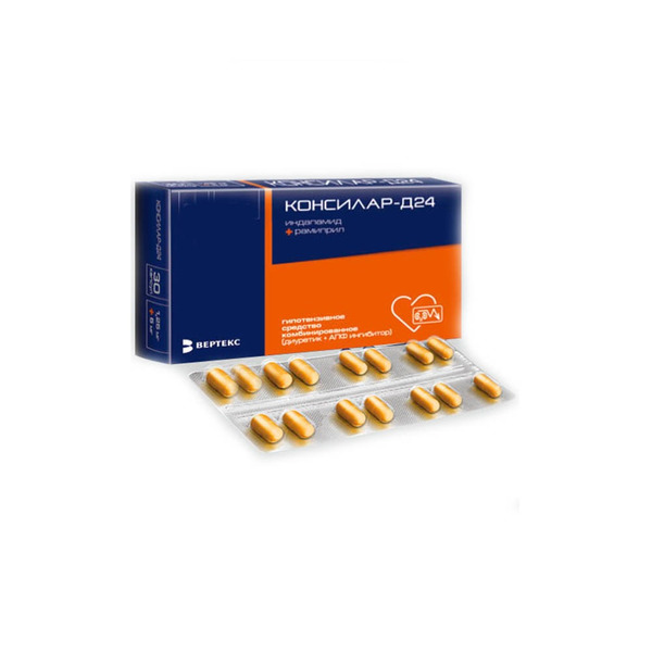 Комбинированный гипотензивный препарат, содержащий диуретик из группы производных сульфонамида - индапамид и ингибитор ангиотензинпревращающего фермента (АПФ) - рамиприл. Фармакологическое действие комбинации обусловлено сочетанием отдельных свойств каждого из компонентов, которые, в свою очередь, усиливают действие друг друга. Препарат оказывает антигипертензивное, диуретическое и вазодилатирующее действия. КОНСИЛАР-Д24 оказывает выраженное дозозависимое антигипертензивное действие как на систолическое, так и на диастолическое артериальное давление (АД). Антигипертензивный эффект не зависит от возраста и положения тела пациента. Не влияет на метаболизм липидов и углеводов, в том числе у пациентов с сахарным диабетом.