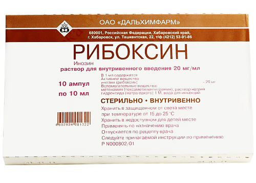 Действующее вещество: инозин (рибоксин) 20 мг; Вспомогательные вещества: пропиленгликоль, натрия гидроксид, натрия сульфит безводный, вода для инъекций.