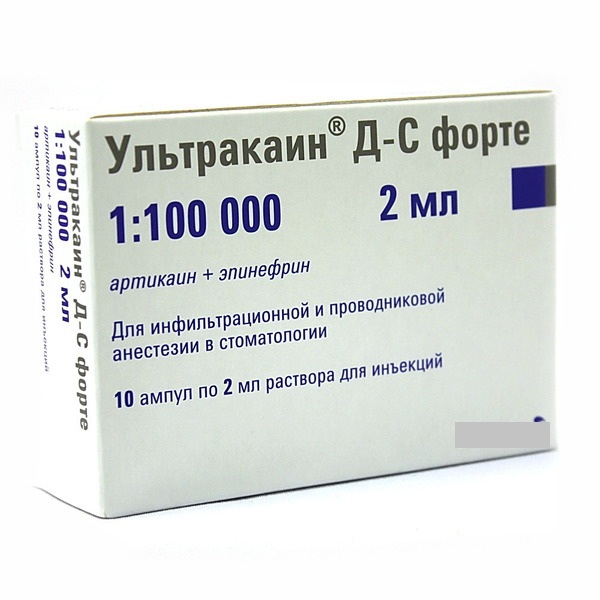 Инфильтрационная и проводниковая анестезия при стоматологических операциях: неосложненные удаления одного или нескольких зубов; обработка кариозных полостей зуба; обтачивание зубов перед протезированием Ультракаин® Д-С форте Инфильтрационная и проводниковая анестезия при стоматологических операциях на слизистой оболочке или костях, когда требуется создание условий более выраженной ишемии: операции на пульпе зуба (ампутация или экстирпация); удаление сломанного зуба (остеотомия); удаление зуба, пораженного апикальным пародонтитом; продолжительные хирургические вмешательства (например, операция по Колдуэллу- Люку); чрескожный остеосинтез; эксцизия кист; вмешательства на слизистой оболочке десны; резекция верхушки корня зуба.