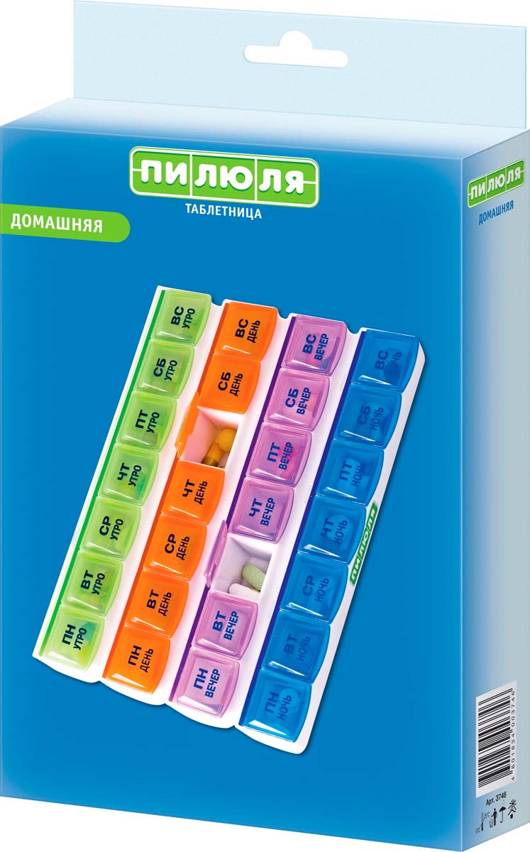 Таблетница-контейнер Пилюля Домашняя. Cодержит 28 отделений, которые соответствуют дням недели, а также суточному режиму приема лекарств: утро, день, вечер и ночь. • Из безопасного, легко моющегося пластика; • Удобная и простая в использовании; • Зарегистрированное медицинское изделие; • Цветная; • Вместительная; • Для дома и стационара.