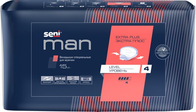 Предназначены для впитывания выделений у мужчин. Уровень впитываемости – 4 капли. Вкладыши быстро впитывают влагу и нейтрализуют неприятный запах, обеспечивая надежную и незаметную защиту. Созданы с учетом мужской анатомии, комфортно прилегают к телу и не ограничивают свободу движения. • паропроницаемый внешний слой позволяет коже «дышать», что снижает риск возникновения раздражений и опрелостей; • впитывающий слой с суперабсорбентом нейтрализует неприятный запах; • дополнительный слой для более быстрого впитывания и равномерного распределения жидкости; • эластичные боковые элементы придают вкладышу нужную анатомическую форму и защищают от протекания по бокам; • мягкий и приятный на ощупь материал обеспечивает дополнительный комфорт в использовании; • три клеевые зоны для надежной фиксации на белье.