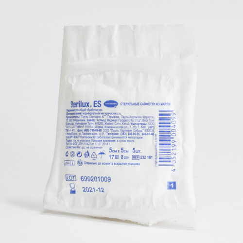 Салфетки из высококачественной хлопчатобумажной марли, 17 нитей на квадратный сантиметр; 8 слоев с подвернутой кромкой; развернув несколько раз, можно использовать в большом формате, при этом края салфетки не осыпаются. Салфетки Sterilux ES отличаются высокой впитывающей способностью и хорошей прочностью, их края не осыпаются. Хлопчатобумажная ткань позволяет без опасений использовать салфетки людям с чувствительной кожей, так как Sterilux ES не вызывает аллергий и не провоцирует раздражений.