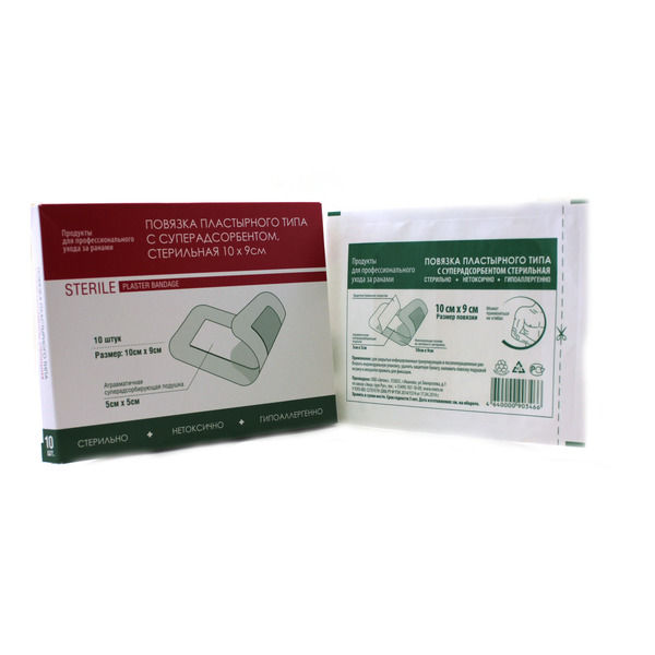 Повязка раневая пластырного типа стерильная с суперабсорбентом. Фиксирующая основа изготовлена из мягкого и эластичного нетканого материала (идеально повторяющего естественный контур тела). Это позволяет использовать повязку на сгибах суставов и сложных поверхностях без стеснения движения пациента. Пористая структура материала позволяет коже свободно «дышать». Гипоаллергенный клей исключает аллергию или раздражение кожи. Повязка отлично приклеивается к коже, легко снимается не оставляя следов. Поверхность впитывающей подушки не прилипает к ране и имеет впитывающую способность более 1100%.