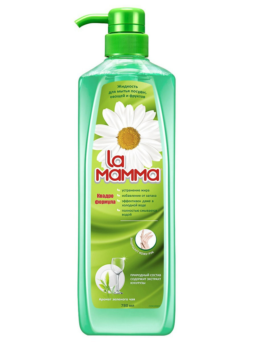 Жидкость Ла мамма (La mamma) аромат зеленого Чая. Универсальный и безопасный моющий состав позволяет использовать средство для мытья посуды, овощей и фруктов. Эффективная формула удаляет жир со столовых приборов и посуды, устраняет вредные вещества и восковой налет на фруктах и овощах. Полностью смывается даже холодной водой, нейтрализует неприятные запахи, обладает свежим приятным ароматом. Специальная увлажняющая формула с экстрактом алоэ заботится и защищает кожу рук. • Достаточно 1 капли или одного легкого нажатия на дозатор; • Безопасный и нетоксичный состав; • Содержит экстракт кукурузы и полисахариды; • Легко смывается водой без остатка; • Эффективно даже в холодной воде; • Бесфосфатный состав; • Природные компоненты ухаживают за руками; • Экстракт алоэ смягчает кожу рук; • Гипоаллергенная формула.
