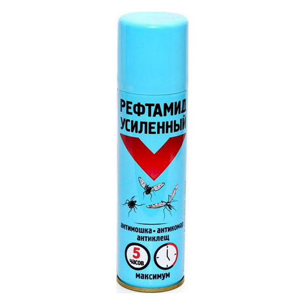 Рефтамид УСИЛЕННЫЙ Максимум — репеллентное средство для эффективной борьбы с кровососущими насекомыми. В его состав входят увеличенные количества действующих веществ, обеспечивающие более длительную (5 часов) и надёжную защиту от комаров, мокрецов, москитов, мошек, слепней, блох, а также от таёжных и лесных клещей.