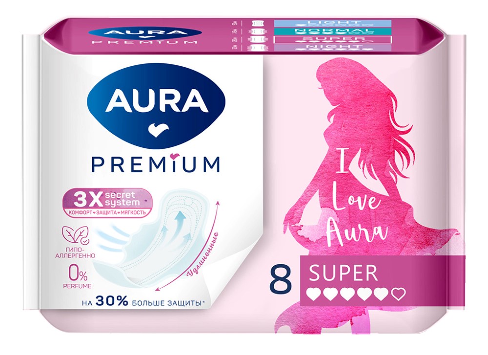 AURA PREMIUM ПРОКЛАДКИ ЖЕНСКИЕ ГИГИЕНИЧЕСКИЕ SUPER. Впитываемость: 5 каплель Женские гигиенические прокладки AURA PREMIUM: ультратонкие и гибкие толщиной не более 2 мм, что делает их незаметными под одеждой. Благодаря специальной технологии производства впитывающего ядра, прокладки мгновенно пропускают влагу и запирают ее внутри. Верхнее покрытие настолько мягкое, что прокладка совсем не ощущается при носке. Удлиненные крылышки по бокам прокладки усиливают фиксацию и дополнительно защищают от протеканий.