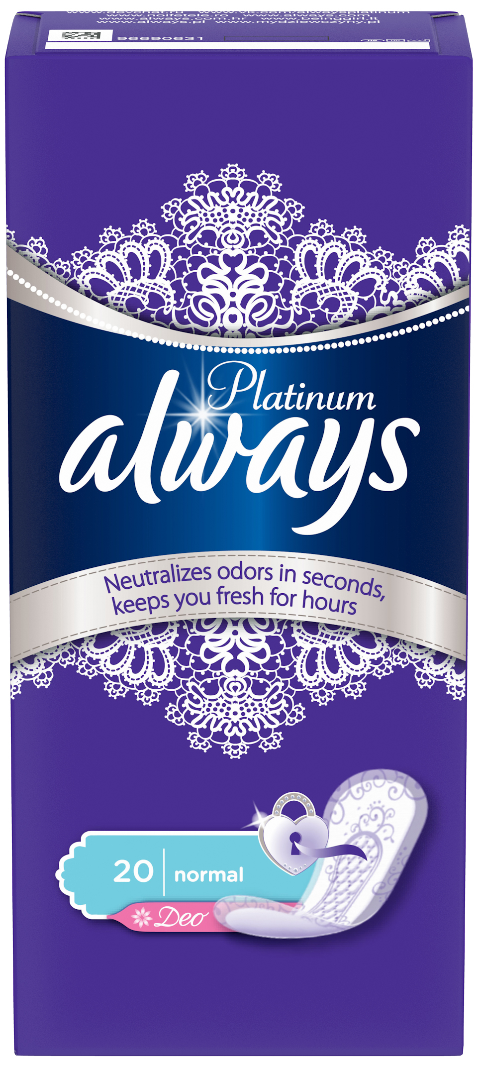 Впервые уникальная технология устраняет, а не просто маскирует запах. Ежедневные прокладки Always Platinum Collection Deo Normal с кружевным узором и стильным дизайном обладают изысканным ароматом, обеспечивая роскошную защиту и комфорт на каждый день. Ежедневные прокладки Always Platinum Collection Deo Normal дарят роскошную защиту и комфорт каждый день. Ежедневные прокладки Always Platinum обладают изысканным ароматом. Упаковка 20 шт. рассчитана на один месяц ежедневного использования.