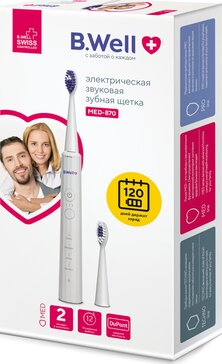 B WELL ЗУБНАЯ ЩЕТКА ЗВУКОВАЯ ЭЛЕКТРИЧЕСКАЯ MED-870/белая - разработана для эффективного и бережного очищения зубов, межзубных промежутков, полости рта и массажа десен. Звуковая технология колебательных движений позволяет очищать поверхность зубов даже в самых труднодоступных местах, а премиальные щетинки Dupont безопасны для эмали и десен. Зубная щетка MED-870 имеет 4 режима и 3 уровня интенсивности для каждого режима: -Ежедневная чистка; -Массаж десен; -Глубокая чистка -Отбеливание зубов; Для чувствительных зубов.