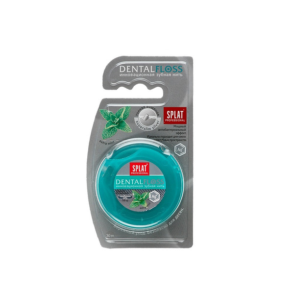 Зубная нить SPLAT Professional Dental Floss супертонкая мятная с ВОЛОКНАМИ СЕРЕБРА. Ультратонкая нить является мировой премьерой от SPLAT. Нейлоновая основа обвивается семью тончайшими волокнами из чистого серебра, в отличие от других подобных нитей, содержащих ионы серебра или пропитанных нитратом серебра. Серебро имеет сильный антибактериальный эффект. В состав нити входит масло мяты – еще один сильный антибактериальный компонент. Результат – двойной удар по бактериям со стороны мяты и серебра!
