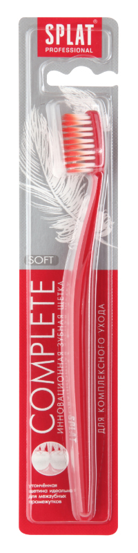 Зубные щетки SPLAT PROFESSIONAL- это новая серия инновационных зубных щеток, не имеющая мировых аналогов! Цвет и форма ручки: красная, округлая. Цвет и жесткость щетины: светло-сиреневая\красная, мягкая. Каждая щетинка зубных щеток SPLAT COMPLETE сужается к концу, что обеспечивает идеальное очищение Щетинки, как нить, проникают между зубами, обеспечивая тщательное ОЧИЩЕНИЕ МЕЖЗУБНЫХ промежутков, придесневой части зуба и труднодоступных мест. Кончики щетинок окрашены в разные цвета, в зависимости от уровня жесткости. ОБЕСЦВЕЧИВАНИЕ кончиков говорит о том, что пора ЗАМЕНИТЬ щетку на новую. Тонкие щетинки СПЛАТ КОМПЛИТ COMPLETE напоминают по форме ворсинки пера, что и нашло свое отражение в символе серии.
