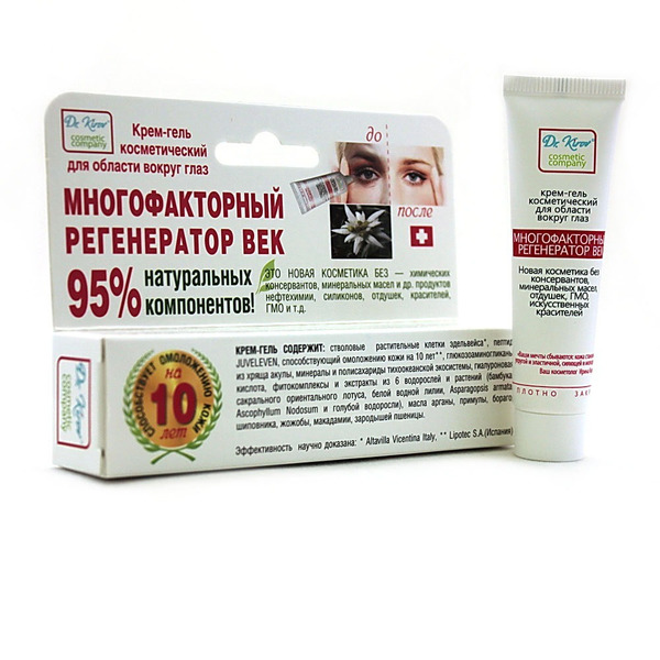 Крем-гель Dr.Kirov Многофакторный регенератор век действует на все механизмы регенерации кожи, в том числе и на собственные стволовые клетки кожи, которые располагаются в нижних слоях дермы и являются предшественниками клеток кожи. Крем предназначен для разрешения таких проблем, как: морщины, тусклый цвет, дряблость, мешки под глазами, сухость кожи вокруг глаз и рта. Крем активно противостоит старению кожи - она становится молодой и сияющей. При регулярном использовании крема уже через 3 недели морщины вокруг глаз и рта заметно разглаживаются, улучшается цвет и структура кожи, увеличивается кол-во коллагеновых волокон. При необходимости крем можно использовать на всю область лица.