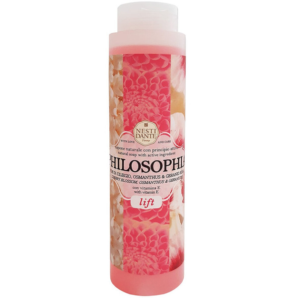 Гель Нести Данте (Nesti Dante) Философия Лифтинг для душа. Роскошный гель для душа "Philosophia. Лифтинг" с комплексом витаминов А и Е омолаживает, подтягивает и разглаживает кожу. Насыщенный аромат цветов вишни и розовой герани наполнит душу радостными воспоминаниями и пробудит чувства. Витамины А и Е, экстракт розовой герани, подарят вам расслабляющий отдых во время принятия душа и помогут коже восстановить силы после долгого дня. Входящие в состав витамины A и E укрепляют кожу, повышают упругость и эластичность, сохраняя ее молодость и красоту. Кожа остается гладкой и шелковистой. Подходит для ежедневного использования для всех типов кожи.