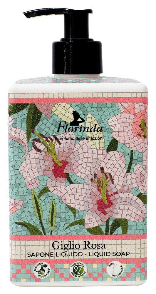 Парфюмеры бренда Florinda, среди всего великолепия флорентийских цветов, отвели особое место для розовой лилии, ведь ее аромат отличается необычайной деликатностью и утонченностью. Тонкий и свежий запах нежных розовых цветов окутает вас невесомым облаком, поможет расслабиться после сложного дня и настроиться на романтический лад. Жидкое мыло с насыщенным ароматом цветов станет стильным украшением вашего дома и легко впишется в любой интерьер, ведь дизайн каждого флакона разработан по мотивам традиционной итальянской мозаики. Кроме того, каждая бутылочка оснащена удобным и экономичным дозатором. Уникальная густая формула жидкого мыла позволит вам насладиться нежной, кремовой пенкой, которая бережно очищать кожу, не пересушивая ее. А входящие в состав натуральные экстракты оливы, мальвы, зверобоя, лилии, календулы и насыщенные жирные кислоты интенсивно питают и защищают кожу от агрессивного воздействия окружающей среды.