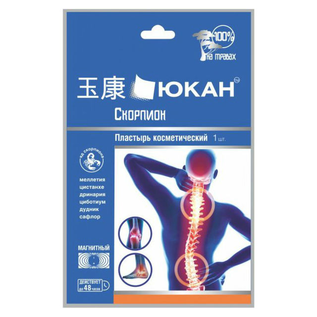 ЮКАН Скорпион пластырь для тела магнитный обезболивающий ортопедический. Назначение магнитного пластыря "Скорпион": лечение заболеваний опорно-двигательного аппарата. Устраняет боль при ревматизме, хондрозе, артрите, радикулите; при шейном, грудном и поясничном остеохондрозе. Китайский пластырь от остеохондроза "Скорпион" также эффективен при гиперостозе, уменьшает отеки; лечит цервикальную спондилопатию, пролапс поясничного межпозвоночного диска, ревматоидный артрит, плечелопаточный и локтевой периартрит, межлопаточные и поясничные боли, пояснично-крестцовый радикулит; артроз коленных суставов. Восстанавливает двигательную активность.