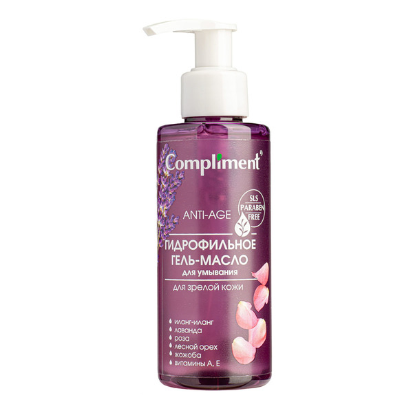 Compliment Гидрофильное гель-масло для умывания для зрелой кожи. Гидрофильное гель-масло для умывания и снятия макияжа ANTI-AGE деликатно, тщательно и нежно очищает кожу лица, не нарушает естественный защитный слой, не сушит кожу, предотвращает преждевременное появление морщин. Благодаря входящим в состав ценнейшим маслам жожоба и арганы, экстрактам розы и лесного ореха, масло борется с возрастными изменениями, способствует восстановлению эластичности кожи. Гидрофильное гель-масло делает кожу чистой, мягкой, гладкой и свежей. Оно не оставляет жирного блеска или липкую пленку, не забивает поры.