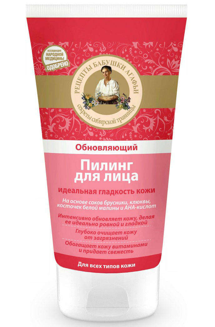РЕЦЕПТЫ БАБУШКИ АГАФЬИ ПИЛИНГ ДЛЯ ЛИЦА ОБНОВЛЯЮЩИЙ - для всех типов кожи Пилинг для лица на основе соков диких северных ягод, созданный по рецептам сибирской травницы Агафьи, обновляет кожу, делая ее идеально ровной и гладкой. АКТИВНЫЕ ИНГРЕДИЕНТЫ: Косточки белой малины и AHA-кислоты удаляют ороговевшие клетки и глубоко очищают кожу от загрязнений. Сок брусники, входящий в состав, богат органическими кислотами и микроэлементами, глубоко питает кожу и придает ей мягкость. Сок клюквы обогащает кожу витаминами, повышает тонус и выравнивает цвет лица.