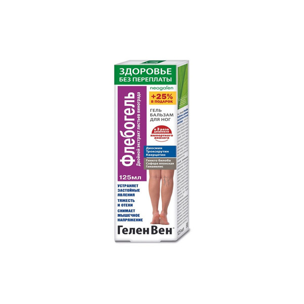 Гель Геленвен для ног венотонизирующий с охлаждающим эффектом. Способствует нормализации периферического кровообращения, устраняет застойные явления, снижает риск тромбообразования, оказывает противовоспалительное и антиоксидантное действие, стимулирует обменные процессы в тканях, снимает отеки и чувство тяжести в ногах, укрепляет венозные клапаны, повышает тонус и эластичность сосудистых стенок.