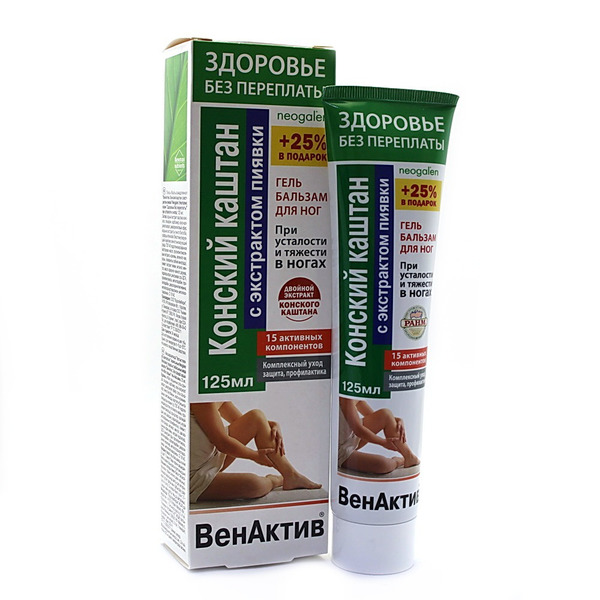 Гель-бальзам Неогален (Neogalen) ВенАктив для ног Конский каштан с экстрактом пиявки - эффективное средство на основе натуральных компонентов для помощи в предупреждении венозной недостаточности и варикозной болезни ног, снятия усталости и тяжести в ногах, уменьшения вечерних отеков. Оказывает венотонизирующее, проти-воотечное, ангиопротек-торное и противовоспалительное действие. Препятствует венозному застою; способствует активизации функции венозных клапанов, микроциркуляции и лимфооттокб, укреплению стенок вен.