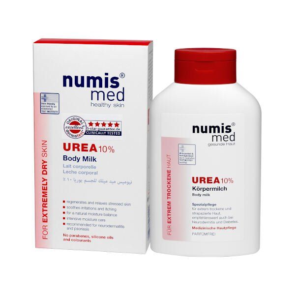 Numis Med Молочко для тела с 10% мочевиной. Ежедневный деликатный уход за кожей тела, подходит и для гиперсухой, проблемной кожи тела, склонной к раздражениям и зуду. Используется в качестве дополнительного ухода за кожей с различными косметическими дефектами, связанными с шелушением, повышенной сухостью, шероховатостью кожи. Быстро впитывается. Успокаивает кожу. Придает ощущение интенсивного увлажнения кожи, восстановления ее гладкости и эластичности. После применения данного продукта даже чрезвычайно сухая кожа хорошо защищена от дальнейшего обезвоживания и неблагоприятных воздействий окружающей среды. Без отдушки. Дерматологически тестировано.