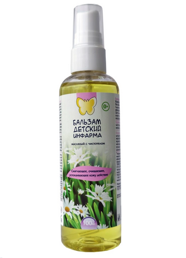 МАСЛО КОСМЕТИЧЕСКОЕ ДЕТСКОЕ БАЛЬЗАМ ДЕТСКИЙ ИНФАРМА МАСЛЯНЫЙ С ЧИСТОТЕЛОМ - Эффективно очищает, смягчает кожу ребенка. Восстанавливает ее эластичность. Внешний вид и свойства: Масляная текстура от прозрачного до светло-желтого цвета с легким, травянистым запахом Возраст: дети с рождения, 0+ и взрослые Травы череды, чистотела, ромашки, входящие в состав обладают противовоспалительным, успокаивающим, регенерирующим действием. Способствуют уменьшению кожного зуда, предотвращают шелушение. Рекомендуется для ежедневного ухода за кожей детей с рождения и взрослых. Детский возраст 0+, можно использовать при массаже. Специальные особенности: Без красителей. Результат: Здоровая, эластичная, упругая кожа.