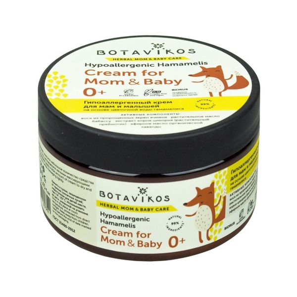 Botavikos, Гипоаллергенный крем для мам и малышей. Гипоаллергенный крем на основе цветочной воды гамамелиса предназначен для бережного увлажняющего ухода за кожей малыша и мамы. Экстракт цикория, богатый природным пребиотиком инулином, формирует барьерный слой, создавая естественную защиту. Воск из пророщенных зерен ячменя успокаивает чувствительные участки, облегчая состояние эпидермиса при раздражении, смягчает его, придает гладкость и шелковистость.