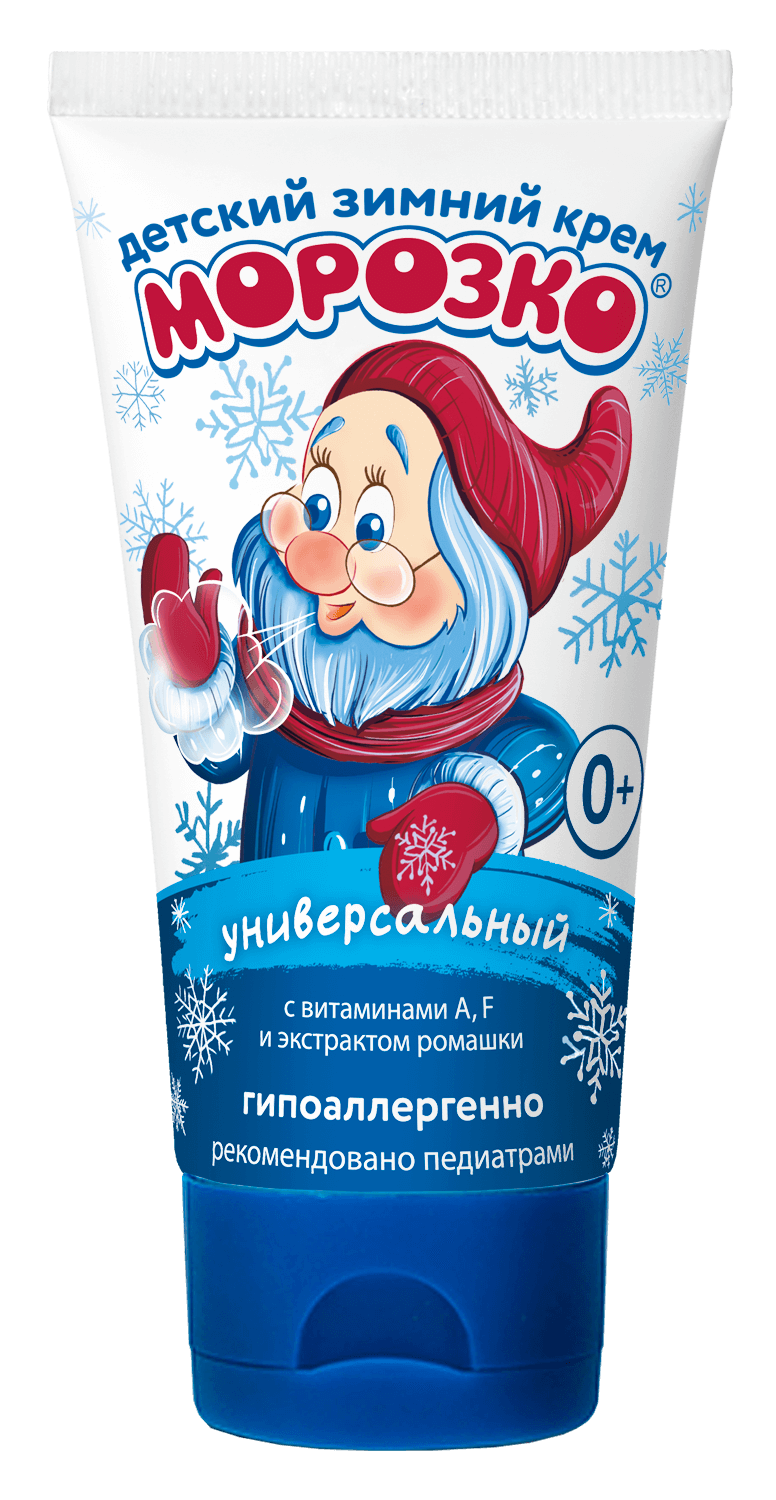 Крем Морозко для детей зимний универсальный. Активные ингредиенты Витамин А поддерживает защитные функции кожи, улучшает её общее состояние; способствует регенерации, в т.ч. при повреждении ультрафиолетовыми лучами; Витамин F придаёт коже мягкость и эластичность; Экстракт ромашки успокаивает кожу, обладает противовоспалительным действием. С учетом погодных условий суровых русских зим была разработана уникальная серия зимней детской косметики «Морозко», в которую входят самые необходимые средства для защиты кожи Вашего малыша зимой.