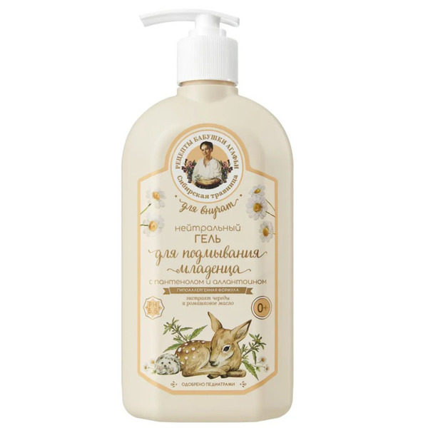 Рецепты Бабушки Агафьи Нейтральный гель для подмывания младенцев 0+ с пантенолом и аллантоином Сибирская Травница. При каждой смене подгузника необходимо тщательно очищать нежную кожу младенца. Иногда это приходится делать до пяти раз в сутки. Нейтральный гель для подмывания можно использовать столько раз, сколько это необходимо. Его натуральная гипоаллергенная формула создана специально для деликатного очищения и ухода за кожей младенца в области пеленания. Экстракт череды содержит ценные дубильные вещества, благодаря которым он оказывает противовоспалительное и антисептическое действие, надёжно защищает кожу малыша от опрелостей и потницы. Ромашковое масло обладает антиаллергенным, бактерицидным и антисептическим свойством. Глубоко питает и смягчает кожу младенца. Пантенол и аллантоин заживляют и защищают кожу от неблагоприятного воздействия окружающей среды, повышают её защитные функции и оказывают увлажняющее действие.