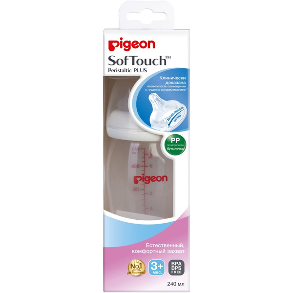 Бутылочка Пиджеон (Pigeon) Перистальтик Плюс силикон соска для детей с 3 месяцев широким горлом 240 мл. Стеклянная бутылочка для кормления Pigeon "Перистальтик плюс" обеспечивает легкость и комфорт во время кормления. Перистальтическая соска выполнена из мягкого силикона. Гофрированная структура верхней части соски обеспечивает естественные перистальтические движения языка младенца, такие же, как при сосании материнской груди, тем самым риск отказа от груди после кормления из бутылочки Pigeon сведен к минимуму. Идеальная форма соски великолепно сочетается с сосательной ямкой во рту, обеспечивая схожесть с маминой грудью. Вентиляционное отверстие в основании соски предотвращает заглатывание воздуха, минимизируя колики. Защитный колпачок предотвращает загрязнение соски.