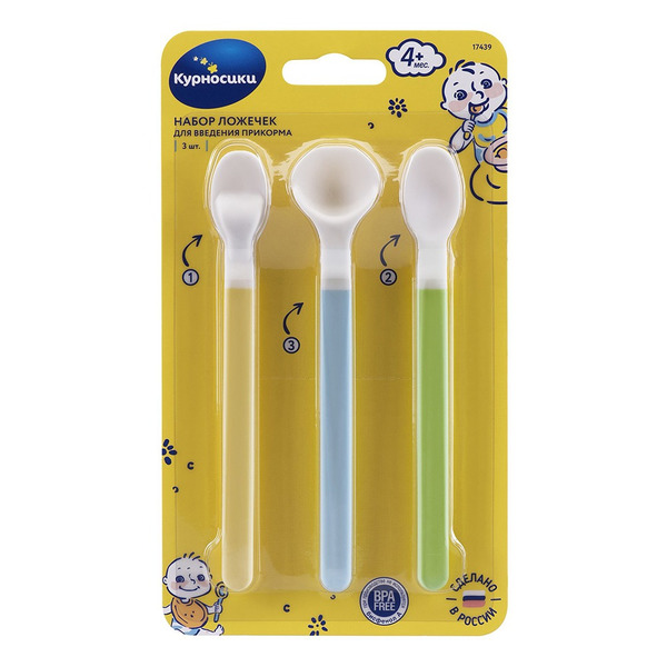 Набор ложечек «Курносики» предназначен для введения первого прикорма. Размеры ложечек и специальная форма с ограничителем идеально подходят для кормления небольшими порциями и питья маленькими глоточками. В наборе три ложечки: две ложечки (с узким ковшиком) для густой пищи и пюре и одна ложечка (с широким ковшиком) для жидкой пищи. Преимущества. Специальный ограничитель и мягкий ковшик помогут избежать случайных травм десен. С помощью длинной ручки удобно доставать еду из контейнеров и баночек.
