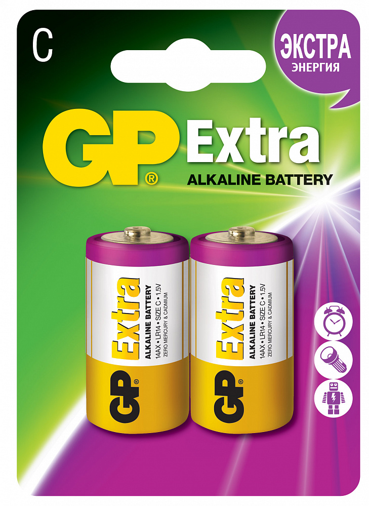 Батарейка алкалиновая GP Extra LR14 (C) 1,5В №2. Преимущества: • Широкий температурный диапазон от -30 до +50°С позволяет использовать элементы питания GP повсеместно в качестве автономных источников питания в домашних условиях, на природе, в командировках. • Современный щелочной электролит на марганцево-цинковой основе имеет преимущество в стабильной энергоотдаче по сравнению с обычными солевыми аналогами. • Низкий уровень саморазряда сохраняет номинальную емкость батарей в условиях их длительного хранения до начала использования. • Алкалиновый сердечник производится без использования тяжелых металлов и вредных примесей. Размеры: 50х22,5 мм.
