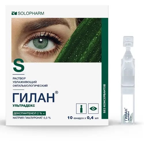 Раствор предназначен для ухода за глазами путем закапывания в конъюнктивальный мешок. Раствор увлажняющий офтальмологический Гилан Ультрадекс воспроизводит действие естественной слезы, защищает и увлажняет поверхность глаза и смазывает ее. Это средство оказывает долговременное облегчающее действие при сухости глаз, обусловленной различными факторами: • нарушения слезной пленки, что приводит к понижению секреции слезы и вызывает симптомы дискомфорта; • воздействие внешней среды (центральное отопление, климатические установки, флуоресцентные лампы, хлорированная вода, "кондиционированный воздух, различные природные явления — ветер, холод, пыль, дым, смог; • частая продолжительная работа за монитором компьютера: зрительное утомление (например, работа с микроскопом, а также при длительном вождении автомобиля}; • использование сосудосуживающих или противовоспалительных офтальмологических препаратов; • повреждения и травмы роговицы; • изменения гормонального фона (менопауза);